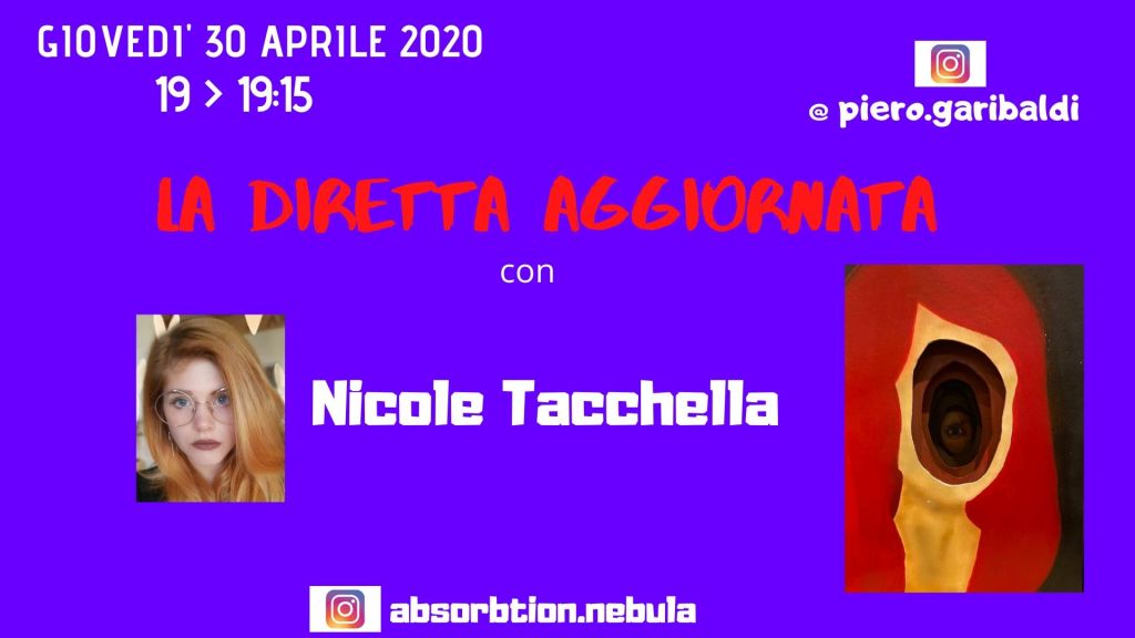 Riscuote grande successo “La Rubrica Aggiornata”, appuntamento settimanale in diretta sul social network Instagram a cura di Piero Garibaldi, profilo di spicco nella progettazione e comunicazione artistica. La rubrica propone una serie di incontri e confronti virtuali che riportano alle tematiche dell’arte ed alle sue molteplici sfaccettature. La diretta di questo ultimo giovedì di Aprile sarà incentrata sulla giovane artista Nicole Tacchella.