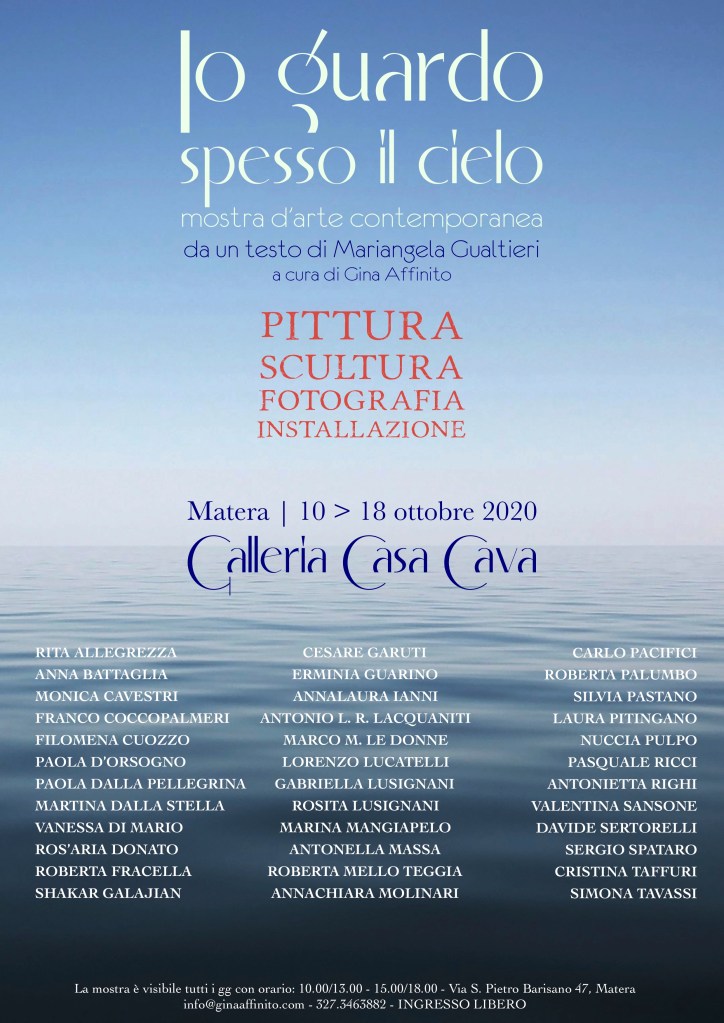 Il curatore Gina Affinito è lieta di presentare il progetto espositivo “Io guardo il cielo” – Mostra d’Arte Contemporanea fino al 18 Ottobre 2020. “Io guardo spesso il cielo. Lo guardo di mattino nelle ore di luce e tutto il cielo s’attacca agli occhi e viene a bere, e io a lui mi attacco, come un vegetale che si mangia la luce.». (Mariangela Gualtieri)