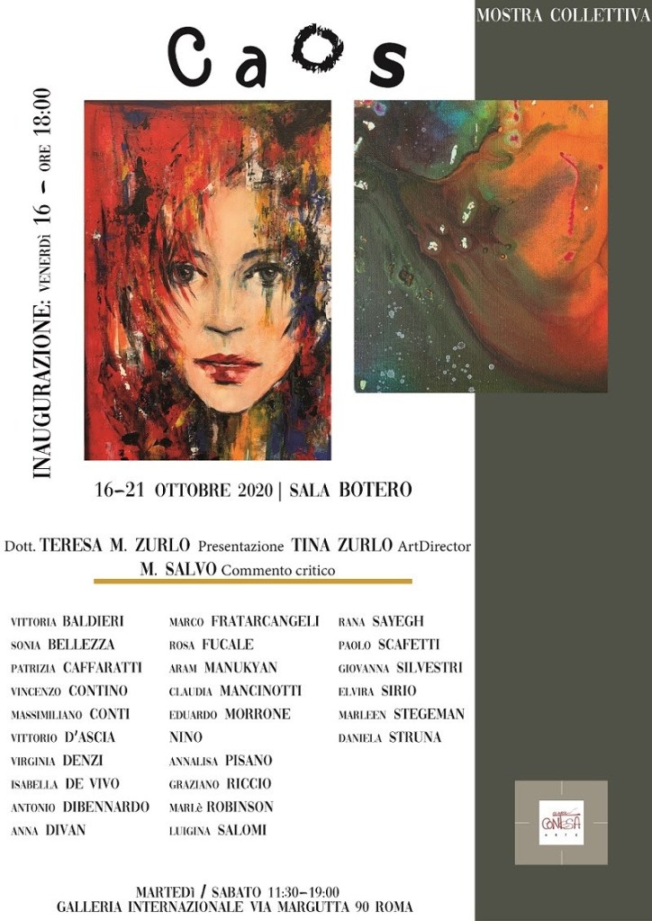 rea Contesa Arte presenta la Mostra collettiva “CAOS” che sarà presente nella Sala Botero dal 16 al 21 Ottobre 2020. Esporranno gli artisti:Vittoria Baldieri, Patrizia Caffaratti, Massimiliano Conti, Vittorio D’Ascia, Virginia Denzi, Isabella De Vivo, Antonio Dibennardo, Anna Divan, Marco Fratarcangeli, Rosa Fucale, Brigitta Ciampi Karner, Aram Manukyan, Eduardo Morrone, Annalisa Pisano, Graziano Riccio, Marlè Robinson, Luigina Salomi, Rana Sayegh, Paolo Scafetti, Giovanna Silvestri, Elvira Sirio, Marleen Stegeman, Daniela Struna.